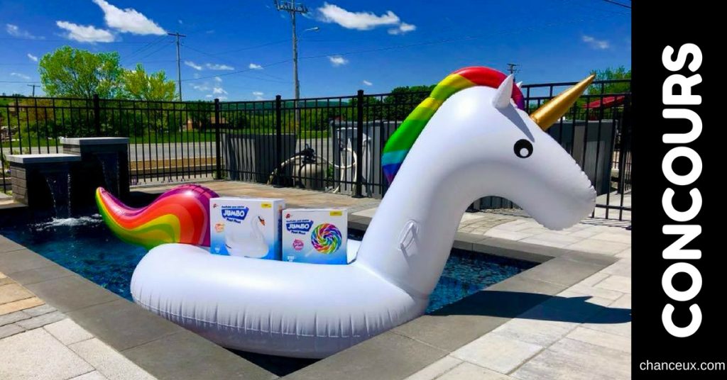 Courez la chance de gagner une ÉNORME LICORNE FLOTTANTE pour célébrer l’arrivée de nos nombreux jeux gonflables et jouets de piscine. Pour participer au tirage, vous devez :